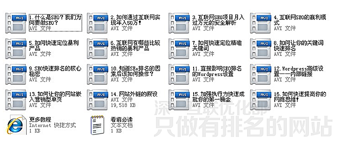 本套深一SEO視頻培訓(xùn)課程包括20部高清視頻+清晰語(yǔ)音+整齊的文本條目,手把手教會(huì)快速?gòu)闹髁魉阉饕嫔汐@得排名,從而獲得無(wú)限網(wǎng)絡(luò)商機(jī)。