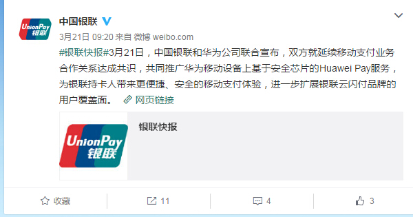 昨天,中國銀聯(lián)和華為公司聯(lián)合宣布,兩邊就連續(xù)移動付出事務(wù)協(xié)作關(guān)系達(dá)成共識,一起推行華為移動設(shè)備上根據(jù)安全芯片的Huawei Pay效勞,為銀聯(lián)持卡人帶來更快捷、安全的移動付出體會,進(jìn)一步拓展銀聯(lián)云閃付品牌的用戶覆蓋面。