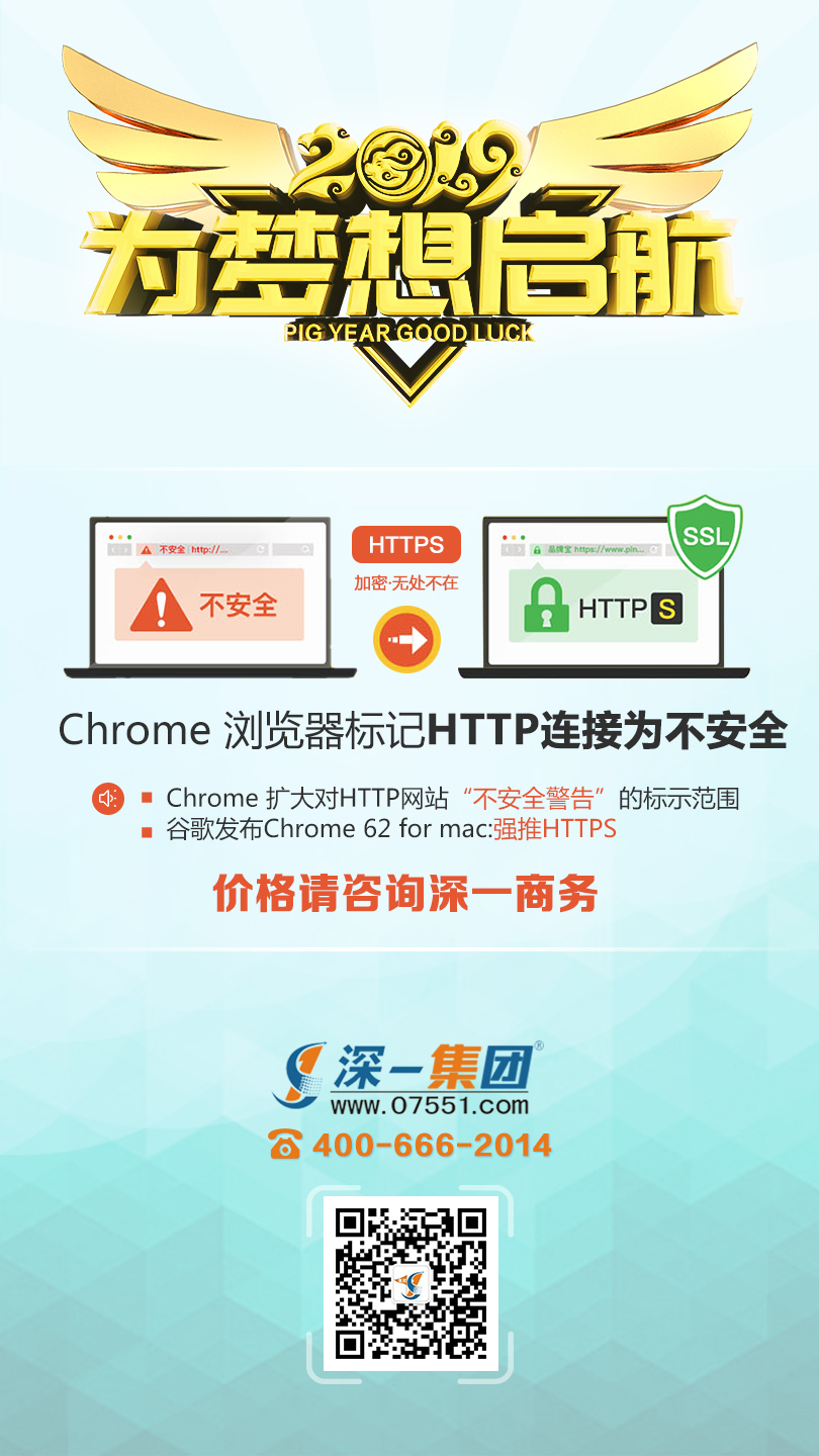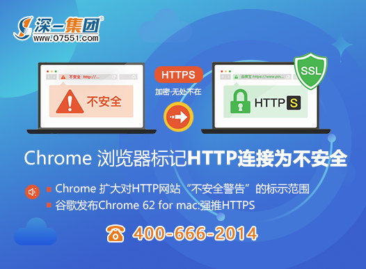[深一SSL證書]HTTPS加密無處不在,谷歌Chronme瀏覽器2017年7月起標(biāo)記HTTP連接為不安全,SSL證書是您避不開的安全保障。詳細(xì)報價咨詢深一商務(wù)!